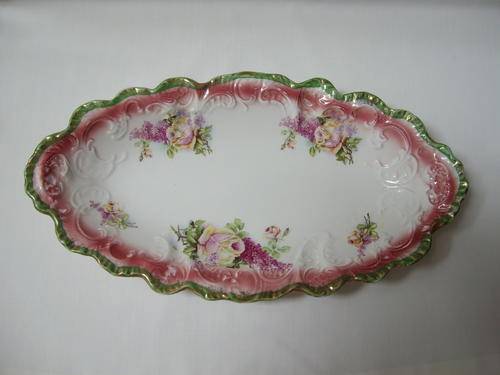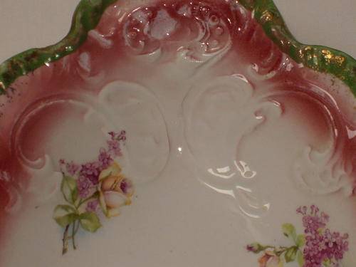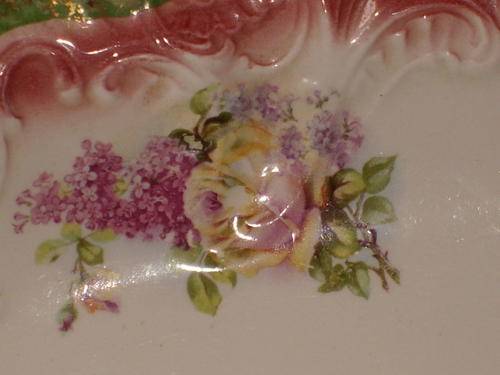 decorated with polychrome transfer-printed roses and pink, green and gilt blushed border.
