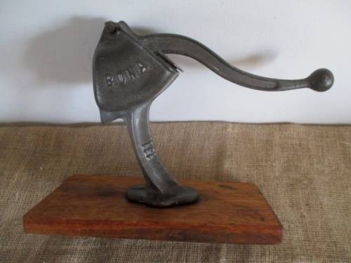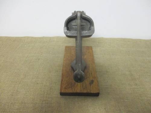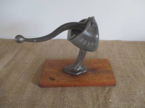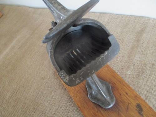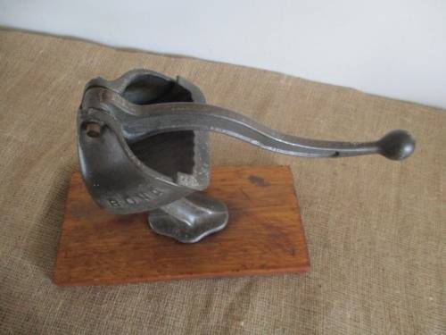 Antique/vintage cast iron Bona Beer 131 lemon squeezer on wooden board Germany Complete and in working order Clean Not cracked or any other damages
