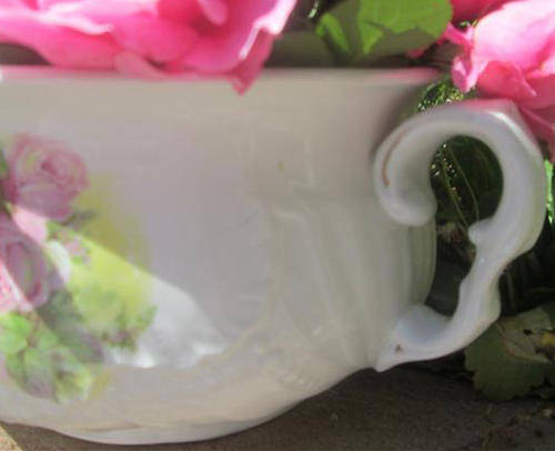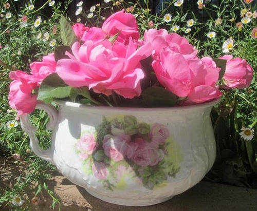 ANTIQUE, CERAMIC CHAMBER POT. RUFFELED, MOULDED RELEIF DESIGN DECORATED WITH FULLY BLOWN ROSE TRANSFERS. YOU CAN SEE FROM MY PHOTOS THIS POT IS PERFECT FOR FLOWERS, IMAGINE THIS USED AT ONE OF YOUR TEA PARTIES, CERTAINLY A CONVERSATION PIECE.....I HAVE ONE IN MY BATH ROOM CONTAINING A POT PLANT, PERFECT FOR AFRICAN VIOLETS.. MOST OF THE GOLD DETAIL HAS RUBBED OFF BUT THIS TAKES NOTHING AWAY FROM THIS BEAUTIFUL POTTY. TOP DIA 22.5cm, HEIGHT 12.5cm. THIS POTTY HAS NO DAMAGE AT ALL.