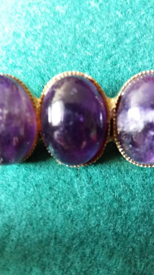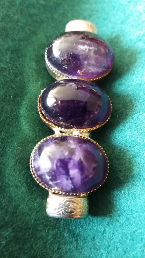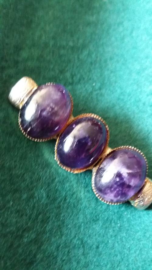 Here we have a genuine 3 cabochon amethysts brooch set in gilt metal and is in excellent condition. I'm not sure if it's gilt over silver or not, it looks like Pinchbeck. The brooch measures approx 5.3cm long and the amethyst cabochons are approx 1.8cm x 1.4cm. Please look at the pictures as they form part of the description. Payment within 3 days after close of auction. SHIPPING SAPO R70. Thanks for looking