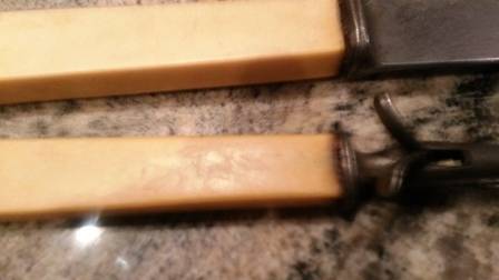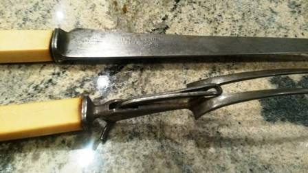 i am not 100% sure but bakelite i think or bone more likely handle - marked witness taylor sheffield warranted handle - these are old but pretty good shape - Regd number on fork - price excl shipping but we can quote if needed