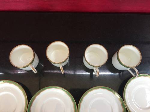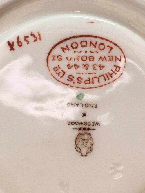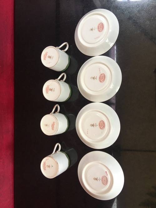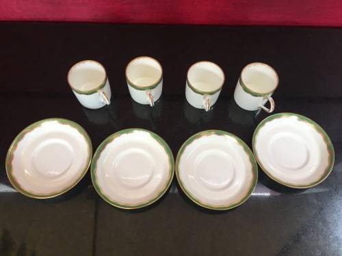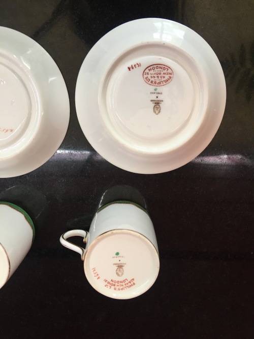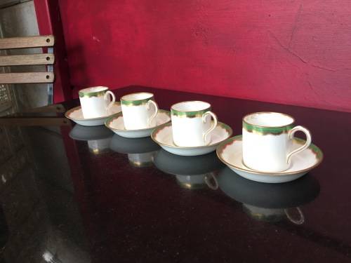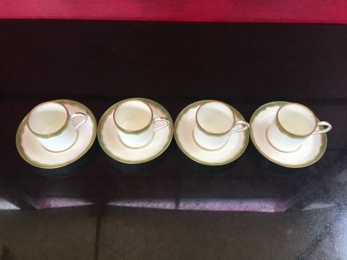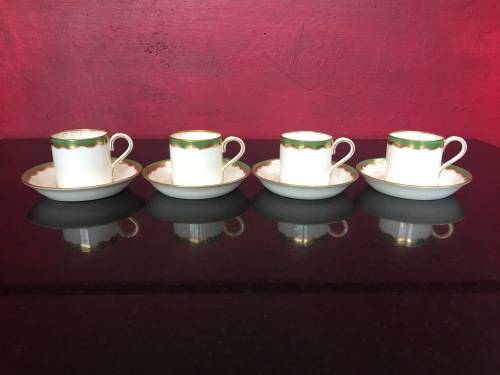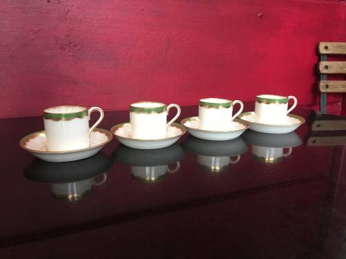 Antique Wedgwood England Phillips's Ltd 43 & 44 New Bond St London c.1908-29 Demitasse Set of 4. Good condition. no damage, no repairs.no chips or cracks. There is slight loss of gold gilt to the pattern inside the rim of cup size 5. 5 cm high Saucer 11. cm.