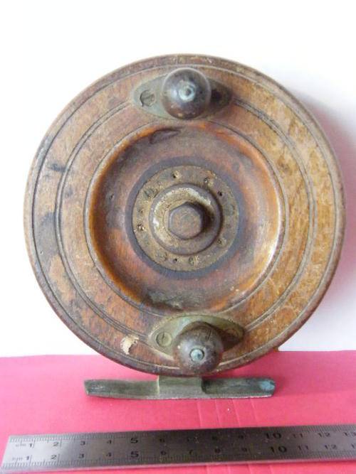 Antique wooden fishing reel with brass foot piece - a bit of the original braid is still on the reel