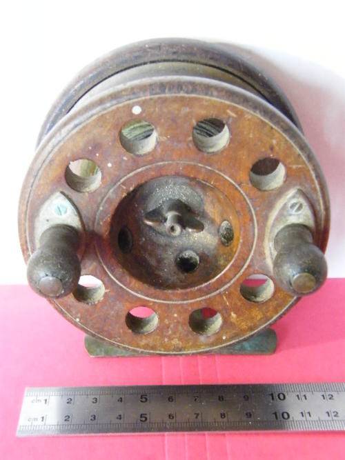 Antique wooden fishing reel with brass foot piece - portion of original braid still on reel