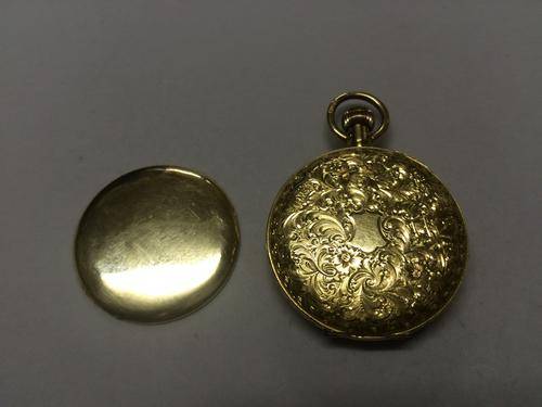 Listed is an Antique Half Hunter Fob/Pocket Watch the measures 32mm in diameter on short side and 45mm on the long side. please note it is sold as is because the back plate is broken as you can see in the pictures. the total watch weight is 30 grams - the little lose plate as shown weighs 1.5 grams on its own. The watch is stamped .750 ( 18ct ) in a few places. When one blows on the mechanical works it starts running but is sold as is/ not working. It comers in the original box.