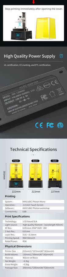 | Important Note: * Due to the Customs limitation rule,SD Card and USB Drive&Gloves. will be Blocked during Clearance.So SD Cards & Gloves will not be included in the Printer Kit Anymore Manuel: https://drive.google.com/file/d/1OAXVM4WtyBdga5giNODnR2zl9GMnre2q/view?usp=sharing Photon Workshop Manuel: https://drive.google.com/file/d/16OKK7JrerNMprH_V1CzlVsTz7zxzVnus/view?usp=sharing Photon Workshop: https://drive.google.com/file/d/1H5n88YEkHsO1gvQ7pnZ8XOW3SrVCNP3O/view?usp=sharing Specifications: System: Anycubic Photon Mono Operation: 2.8 Inch Touch Screen Connectivity: USB Technology: LCD-based SLA Light Source: High Quality Filament(Wavelength 405nm) XY Res.:0.051mm 2560*1620(2K) Z Axis Res.:0.01mm Layer Res.: 0.01-0.15mm Printing Speed: MAX 50mm/h Rated Power:45W Dimensions: Printer Size: 222mm(L)*227mm(W)*383mm(H) Build Volume: 130mm(L)*80mm(W)*165mm(H) Material: 405nm UV Resin Package Included: 1* Photon Mono