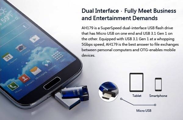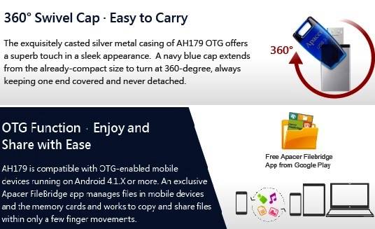 Apacer AH179 OTG USB 3.1 Gen1 Dual Flash Drive is a SuperSpeed dual-interface USB flash drive that has Micro USB on one end and USB 3.1 Gen 1 on the other. Designed with a sleek appearance and miniature size, this highly portable drive comes with 360° swivel cap that always keeps the ports covered. It is the best answer to file exchanges between personal computers and mobile products.