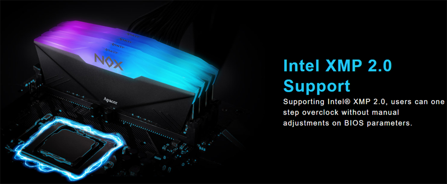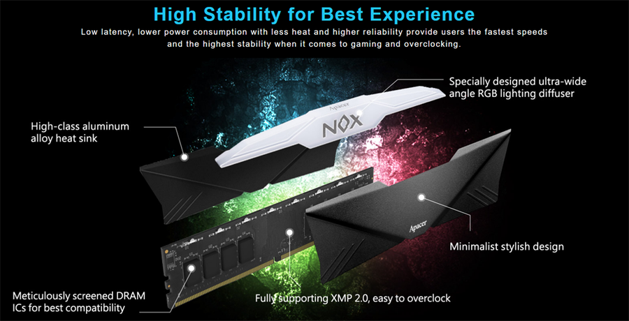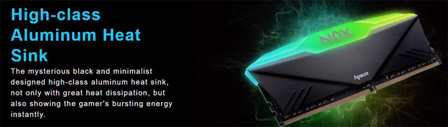 APACER NOX DDR4 8GB 3200MHz RGB Feel the Power & Speed Inside Your PCNOX RGB DDR4 Gaming memory moduleThe rest of the memory is covered with matte black, textured, aluminum heat spreaders, which have an angle bent into the spreaders, directing your eyes to the Apacer name painted on them, and for accents, wither side has three ribs which are near perpendicular to the angled bits above them.