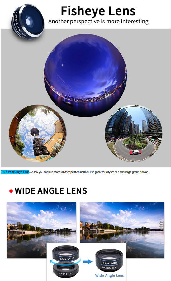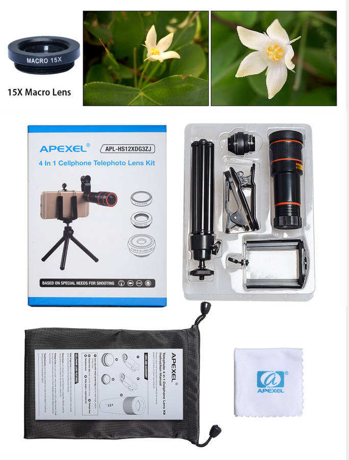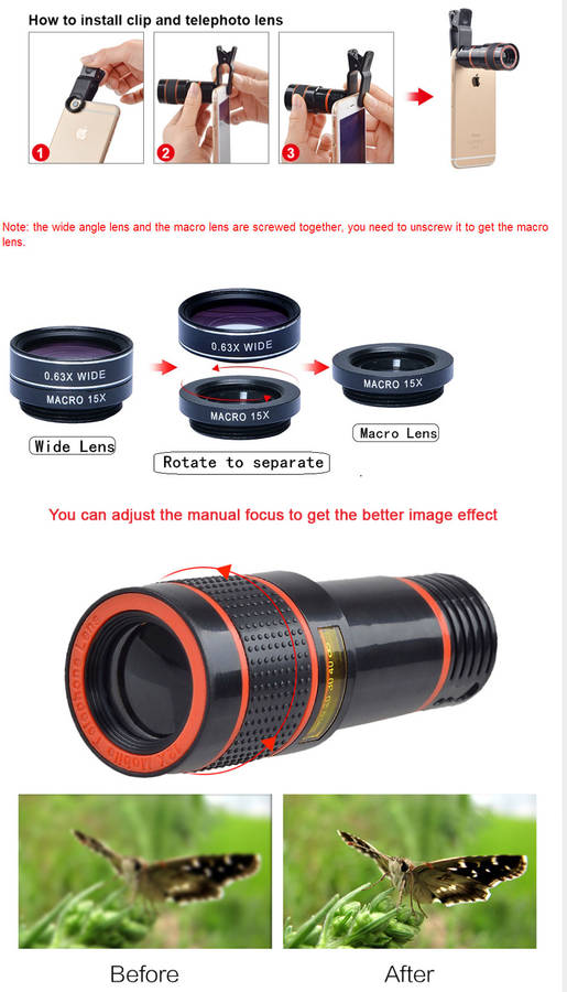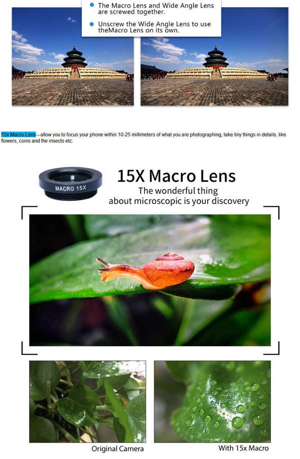 Marco Lens: Magnification: 15X; The shot distance is between 10-23mm;Dimensions(main body): 20 x 6mm (Diameter x Height)