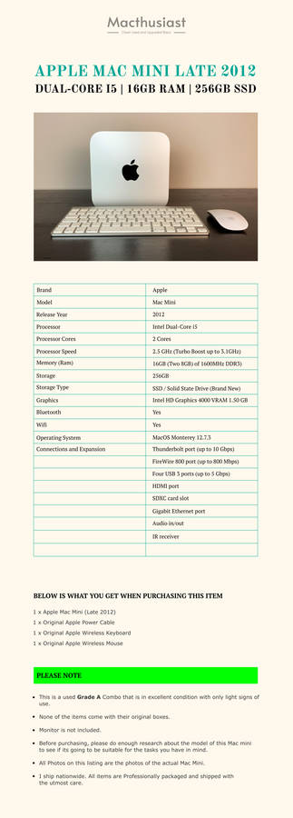 Apple Mac Mini | Dual Core i5 | 16GB RAM | 256GB SSD | MacOS Monterey
