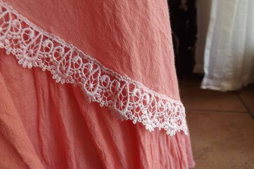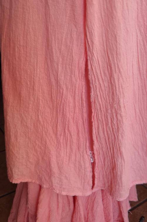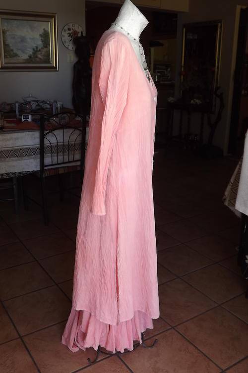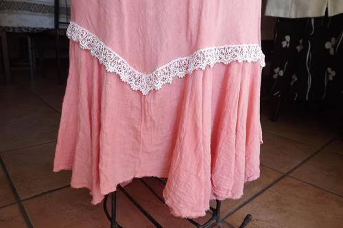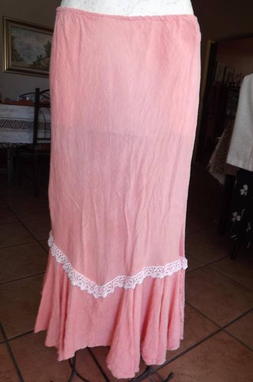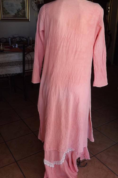Apricot Colour Tie Dyed 2 Piece - Skirt in size 16/40 and Long Jacket in size 14/38 by Love - Colour a faded in certain areas - skirt has high/low frill with lace decoration - very comfortable style
