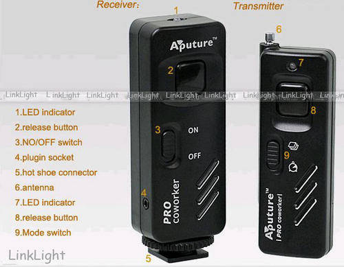 Aputure PRO COWORKER, A New design and Multi-purpose wireless remote kit with a exchangeable cable, is designed for Canon, Nikon, Sony, Olympus etc., .For different brand cameras, you only need to change corresponding cable. Also Receiver light standing on the top is very human design, let you easily find whether auto-focus or shooting.