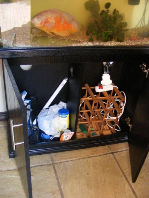 Top section of cabinet (rests on top of glass tank) has space for fluourescent strip light and equipment. Sliding glass top of tank for easy feeding etc.