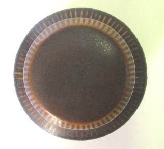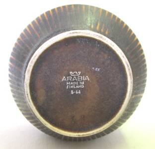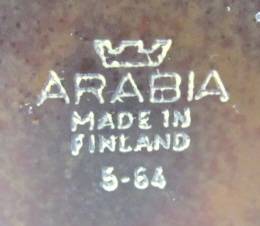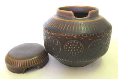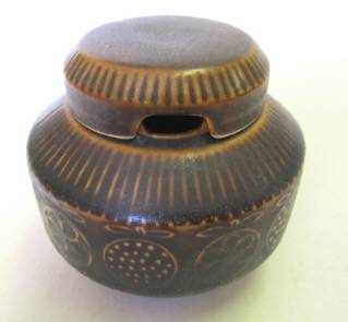 A lidded sugar bowl (or jam jar) made in Finland by Arabia, probably in the 1960s. It has an embossed design and a semi-matt glaze. Condition good (the base mark is still clear, suggesting that it was hardly used). Height (with lid) 95 mm; rim diameter 60 mm.