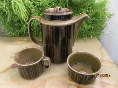 EACH OF THESE ITEMS IS PART OF THE ARABIA FINLAND KOSMOS SERIES WHICH WAS DESIGNED BY GUNVOR OLIN-GRONQVIST AND RELEASED IN 1962. THE SERIES WAS HUGELY SUCCESSFUL ON AN INTERNATIONAL LEVEL AND WAS DISCONTINUED IN 1976. THE LOT/SET CONSISTS OF A SUGAR BOWL WHICH GIVES NO INDICATION THAT IT SHOULD HAVE A LID (GROOVES ETC IN THE RIM), A CREAMER AND A GORGEOUS COFFEE POT