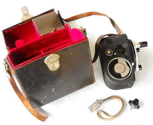 It comes complete in its original brown leather ARCO case with carry strap. It also has a screw in detachable hand carry strap and a tripod attachment screw.