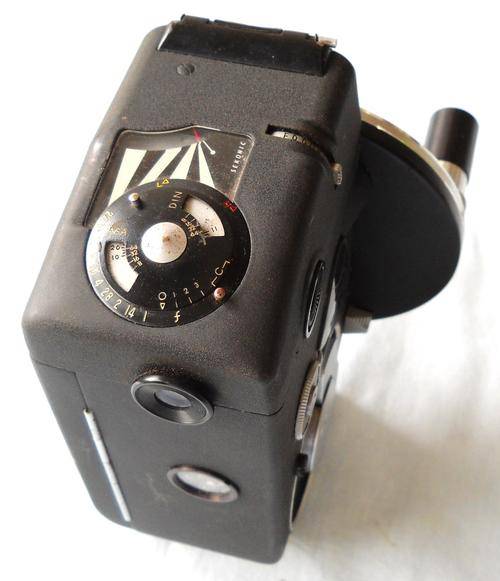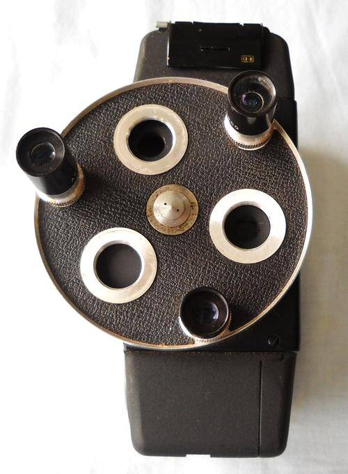 It takes 8mm film. It has a 3 lens turret for 6.5 mm, 13 mm and 38 mm.