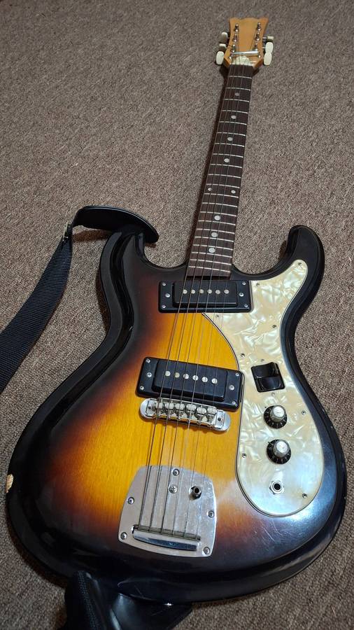 This vintage Aria Diamond electric guitar features a solid body design with a stunning mother of pearl strikeboard, dating back to the early 1970s (1971-1972). Perfect for collectors, musicians, or enthusiasts seeking a unique piece of musical history.