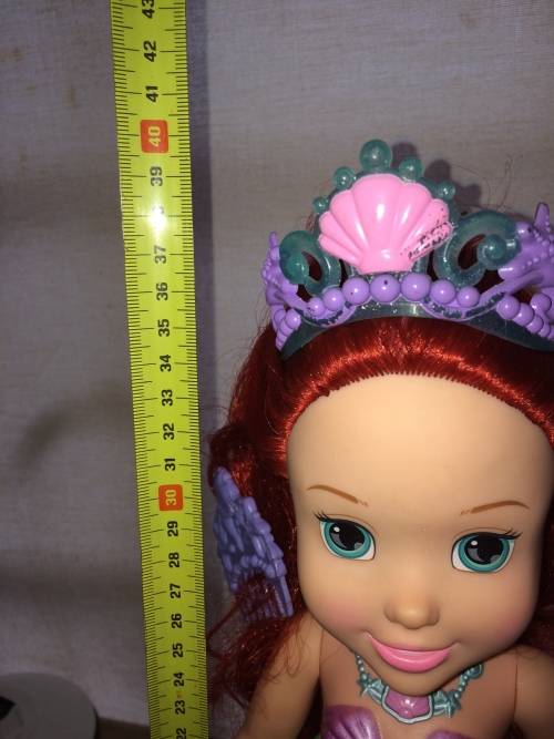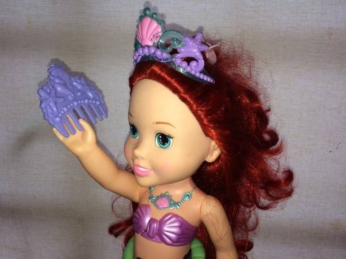 Ariel mermaid doll - well used: hair a bit caked and it takes batteries, but the sounds aren't working as it might have gotten water in. Butterfly sticker on tummy. Still a lovely doll for a little girl to play in and out of water. With crown and comb. She is about 37cm tall and can stand on her hard mermaid's tail.
