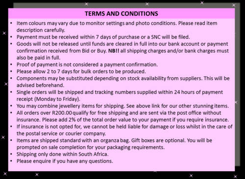 R65.00 Standard shipping applies to orders under R100.00, in most areas in South Africa. R35.00 Standard shipping applies to orders over R100.00. Some areas may attract a surcharge surcharge. This will be calculated at checkout if applicable.