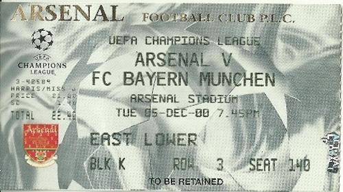 Arsenal v Bayern Munich 2000/01 UEFA Champions League Group Stage Match Ticket