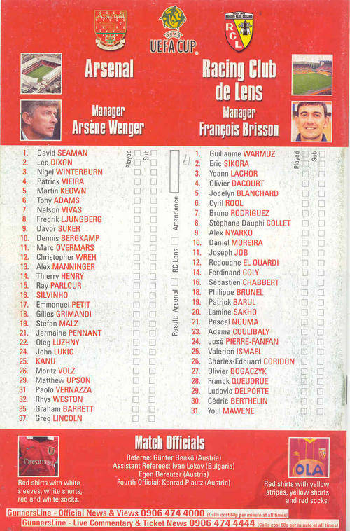 Arsenal v Racing Lens 1999/2000 UEFA Cup Semi Final 1st Leg Official Programme