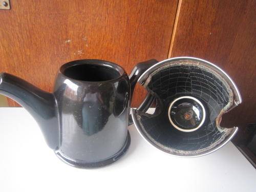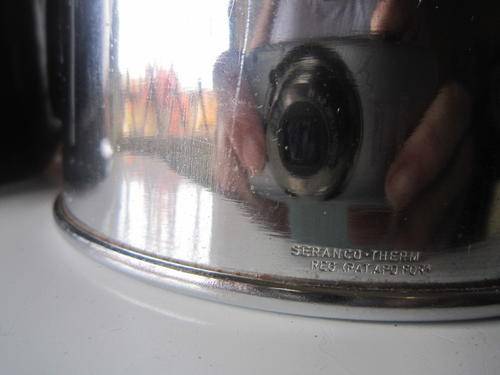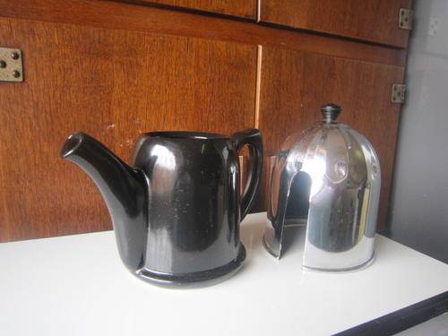 I love, love, love this stunning coffee pot, totally Deco with the little Bakelite top, above the chrome cover that has an attached tea cosy and then the top of the coffee pot is actually attached to the chrome cover. The pot is in brilliant condition as is the chrome cover overall. The cover has a bit of pitting and a few scratches but I just dusted the cover and washed the pot, so the cover might come up better if polished. Chrome cover is marked Seranco - Thermal, Reg. (Pat. Apd For). 26.5cms Long, 14cms wide and 21cms high. 75.00 postage