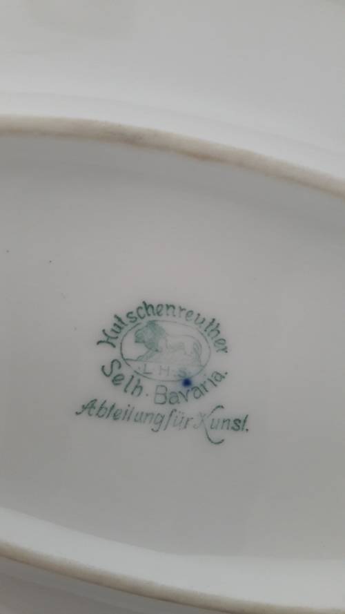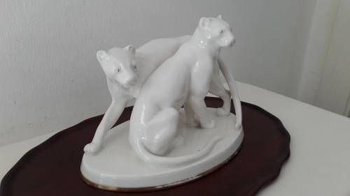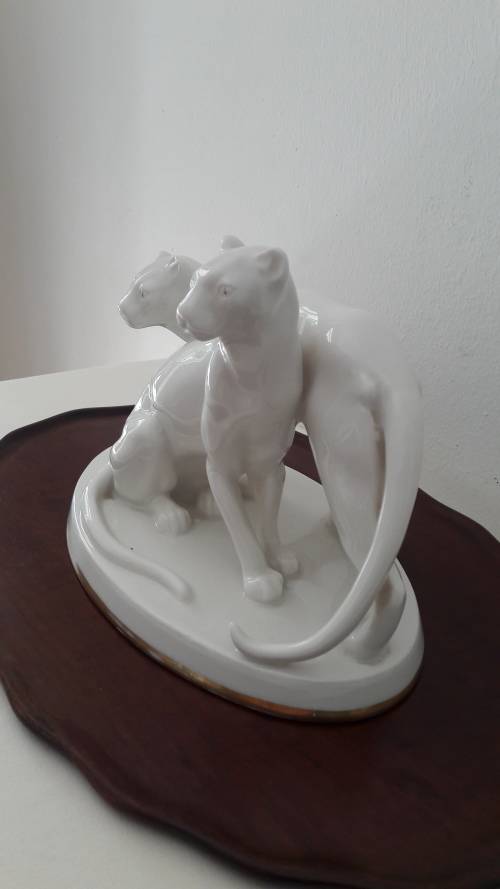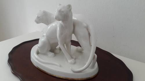 Offered for sale is a fine Art Deco Hutschenreuther porcelain figural group of two panthers , one seated and one striding. This is an Art Deco piece dating to approximately the 1930's made in Bavaria German. It is a slip cast blanc de chine porcelain piece with a satin finish and hand painted gilding around the base and for the eyes of the cats. The oval base has the green makers stamp which reads Hutschenreuther Selb Bavaria Abteilung fur Kunst (Art department). The piece is in good condition ; there is gilt loss/rubbing to the slim gold painted border around the base in the front.