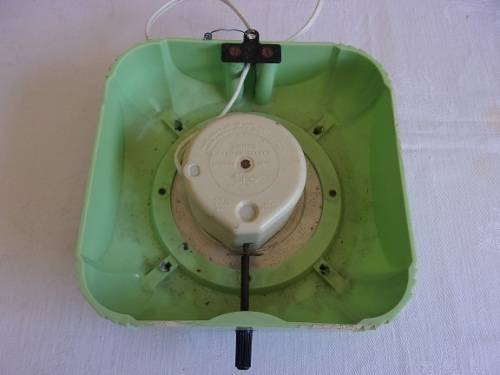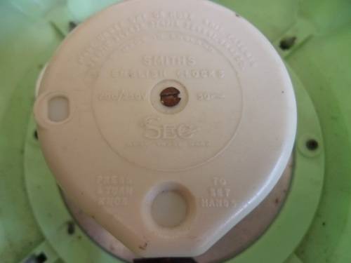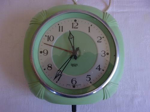 Art deco light green bakelite Smiths Sectric wall clock. This old English made electric wall clock would have been produced in the 1930s. It is very art deco, being made from bakelite with a glass front cover. The electric wire is fed through the top, with the time adjustment knob at the bottom. The clock measures 16cm x 16cm. The clock is untested, but is in good condition with the original mechanism. Great buy for your home.