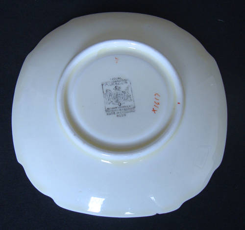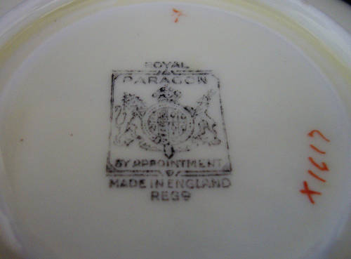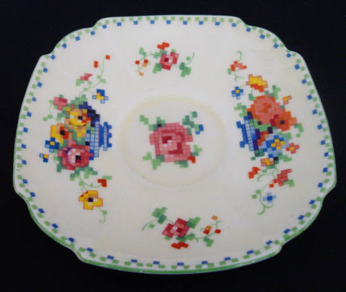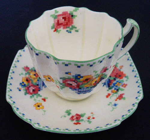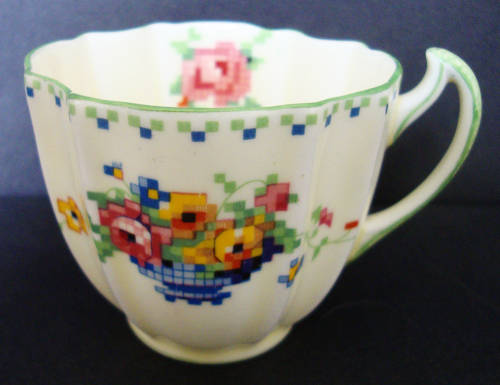 ART DECO ROYAL PARAGON BY APPOINTMENT - MADE IN ENGLAND - DUO - SMALL CUP AND SAUCER CIRCA 1933 - CROSS STITCH PATTERN ON PALE YELLOW BACKGROUND WITH GREEN HANDLE AND TRIM.