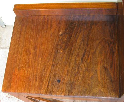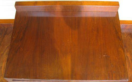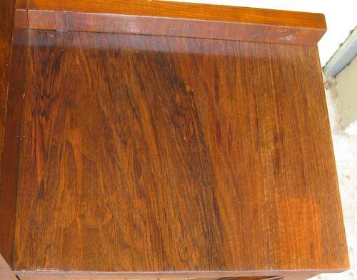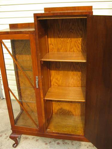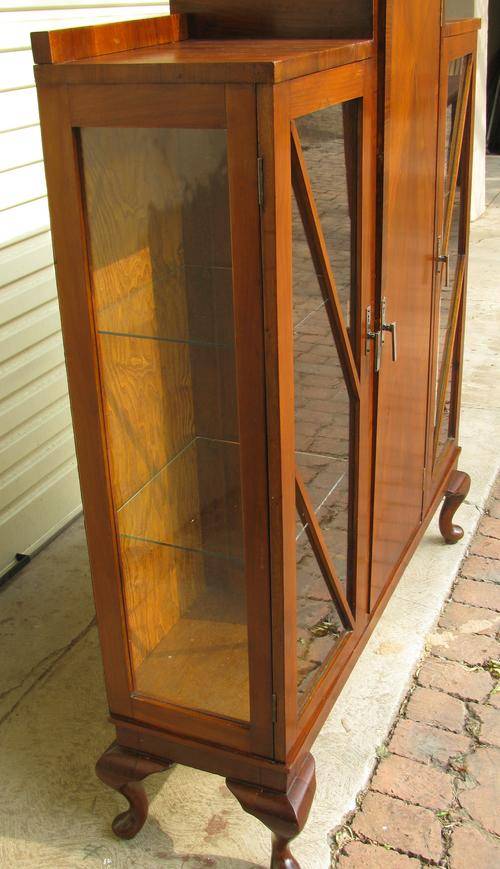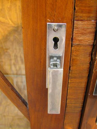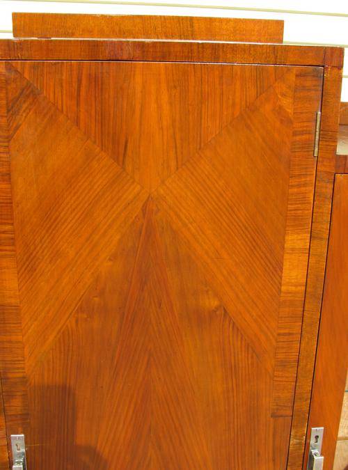 Very nice example of an Art Deco cabinet in mahogany - partly solid, partly veneer, small patches of which were repaired in several places. The middle door has a beautiful veneer pattern. The handles are original. The tops have a few small marks, see pics. The side compartments have 2 glass shelves each. Overall, this showcase is in excellent condition. Size 1.42m high (at the highest point), 1.20m wide, 36cm deep.