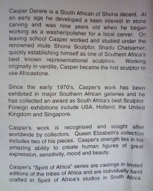 The late Casper Darare's sculptures are world renowned. He was commissioned by the British Royal family and his work was displayed in the Louvre in France. Since the 1970s his sculptures have been exhibited in major galleries in South Africa, the United States, Holland, the United Kingdom, USA and Singapore.