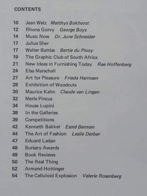 Jean Welz, RhonaGorvy, George Boys, Julius Sher, Walter Battiss,Elsa Marschall, Maurice Khan, Merle Pincus, House Lupini, Kenneth Bakker, Eduard Ladan, Armand Hottinger