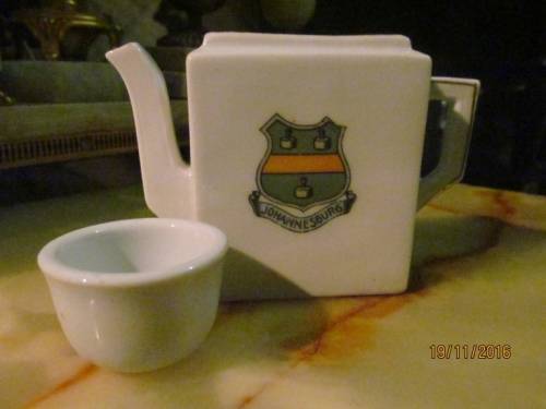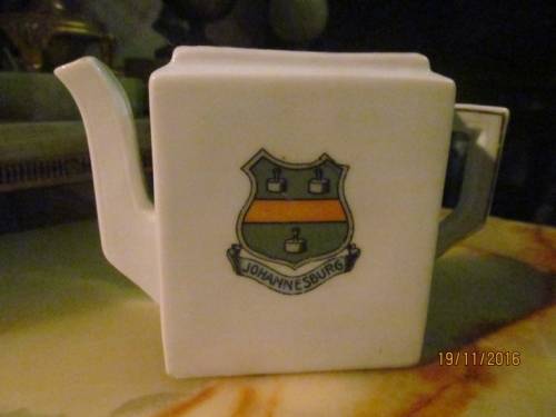 3- Fine Porcelain Tea Pot (Decorative and/or Ornamental) rectangular shaped with the Johannesburg Coat Of Arms on one Side (This was the Coat of Arms of the City of JHB when it was part of the TRANSVAAL Province). The Tea Pot also has Gold Trim. Besides missing its Lid, this item is in PERFECT condition with NO chips, cracks or damages. It is 8.4cm height......6.4cm length of handle ....7cm left to right...........4.8cm width...........12.7cm from tip of spout to back edge of handle