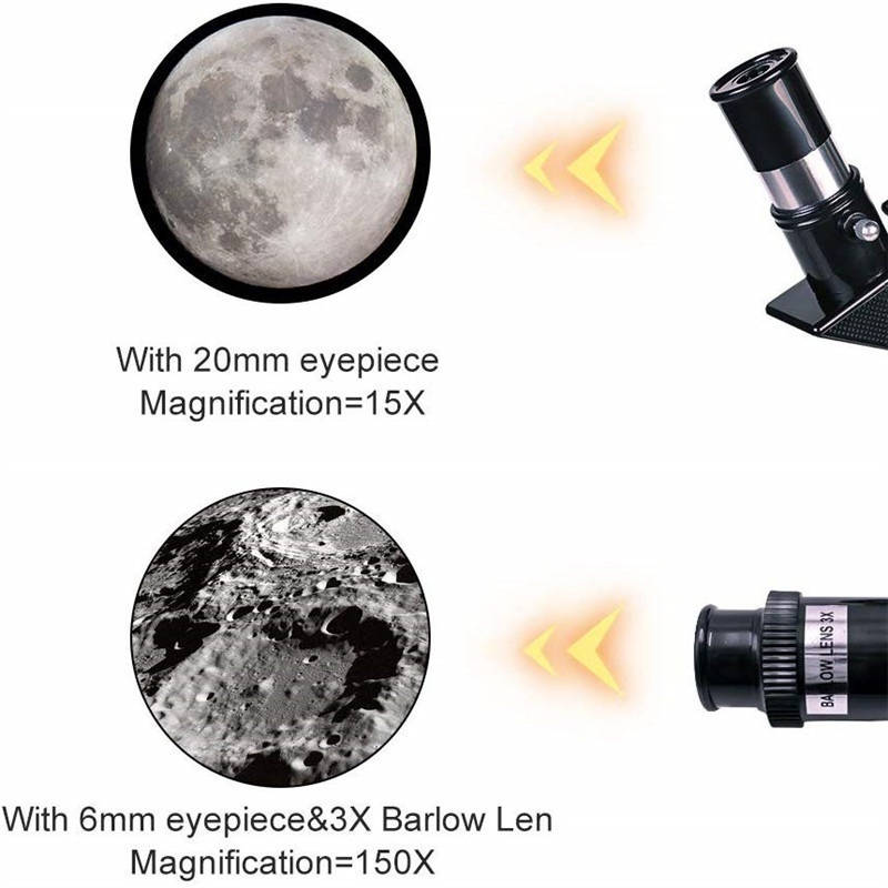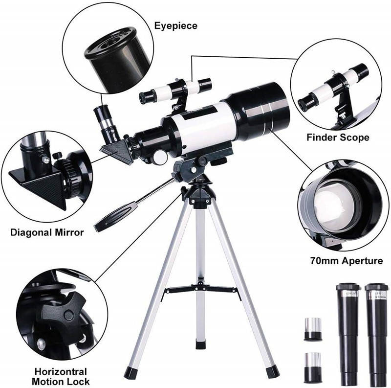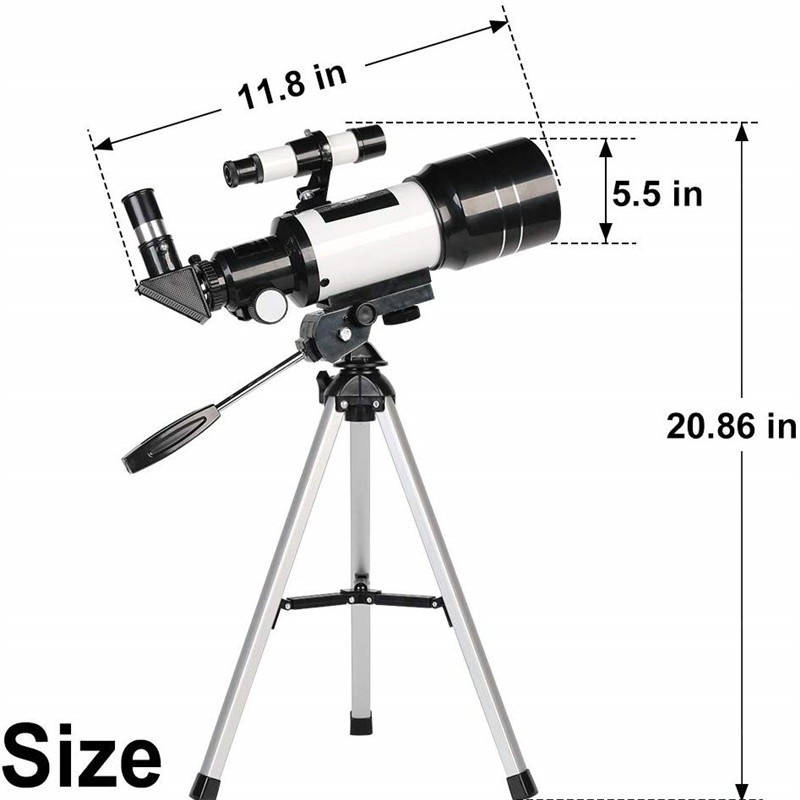 Features: -BEST Telescope for Kids& Beginners! telescope meets all the needs of beginners, and the kids’ astronomical journey begins from here! Equipped with 3X Barlow len and two eyepieces, H20mm and H6mm, kids can get magnification of 15X to 150X. Whether it's watching stars and moons at night or observing planets, telescope is the best helper for kids & astronomy beginners. -Large Aperture 70mm aperture and 300mm focal length provide more lights and clearer images, even beginners can get clear images. The bigger the aperture, the bigger the field of vision, and the clearer the image. -Wireless Control telescope set includes one smartphone adapter and one Wireless camera remote to explore the nature of the world easily through the screen and take amazing images. -Easy to assemble& dismount We have a full set of paper and video Installation Guidelines. Don't worry about any installation problems. Even for first-time users, kids&beginners can install it themselves without any tools.