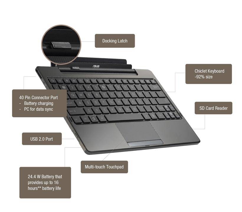 A touchpad, 3.5mm audio jack, two USB ports as well as a built-in SD Card reader for easy file sharing and storage expandability makes the Transformer a versatile media hub. The docking station also extends the Transformer’s 9.5 hours* of battery life up to 16 hours*, so users can use it all day for work and play.