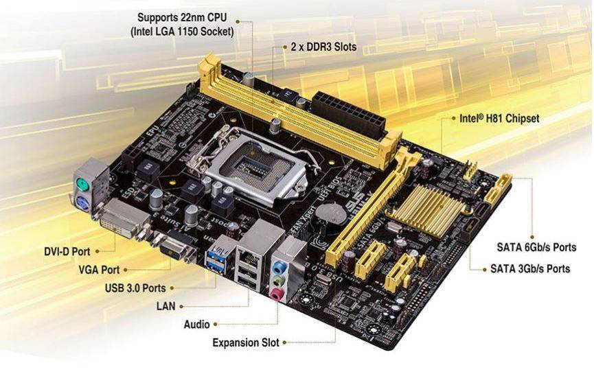 Asus H81M-K LGA 1150 Motherboard, support LGA 1150 for 4th Generation Core i7/Core i5/Core i3/Pentium/Celeron Processors, with DiGi+ VRM 3-phase digital power design + stainless steel back I/O port + 100% all high-quality solid capacitors + EFi mouse-controlled bios; Intel H81 chipset, 2x Dual Channel DDR3-1600, 4x SATA (2x SATA6G + 2x SATA3G), on-board dual-display VGA with dual -output (DVi + D-sub), on-board Realtek ALC887 7.1 + Realtek 8111G Gigabit LAN; 2x PCI-e (1x), 1 x PCI-e 3.0 (16x), 2x USB 3.0 + 2x USB 2.0, USB 3.0 with UASP (USB Attached SCSI Protocol), with EPU + anti-surge protection, 2x PS2 - Micro-ATX Form Factor, OEM Box , 3 year warranty