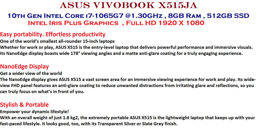 Asus VivoBook X515JA 10th gen Intel Core i7-1065G7 @ 1.30GHz ,8GB, 512GB, 15.6" Full HD