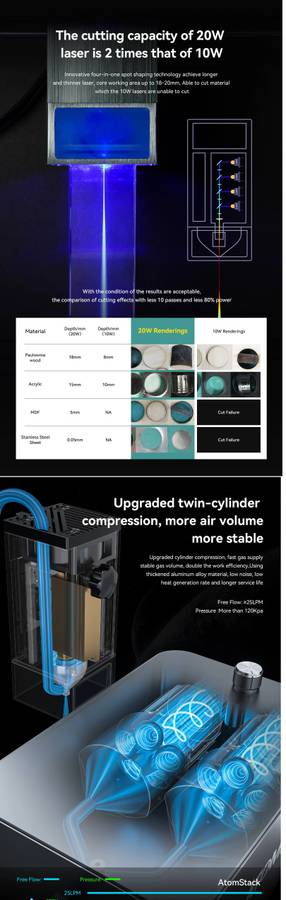 Without a doubt, the Atomstack A20 Pro is now the most powerful diode laser engraver. It is equipped with the world's first quad-core laser module. Four 6W lasers are coupled into a 20W super laser, making the A20 Pro the absolute ruler in the field of engraving and cutting.