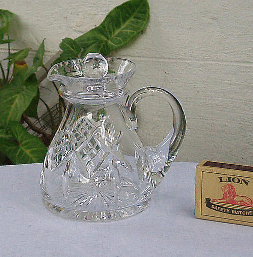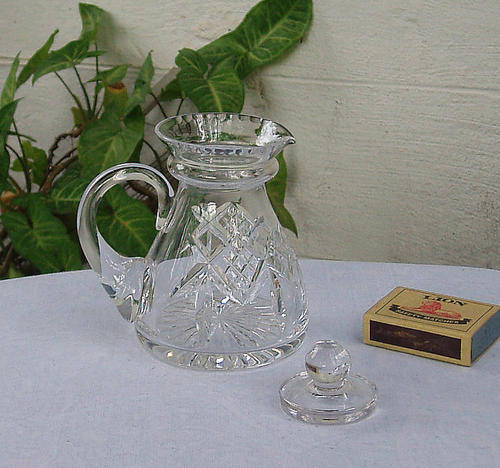 NICE GENUINE STUART CUT PATTERN CRYSTAL JUG WITH HANDLE AND DETACHABLE LID, STAR CUT BASE.....IDEAL FOR SALAD DRESSING OR OLIVE OIL, EVEN CREAM OR MILK FOR TEA. FULLY ETCHED STAMP TO BASE BENEATH HANDLE (HARD TO PHOTOGRAPH, BUT THERE ALL THE SAME). PERFECT CONDITION....NO CHIPS, CRACKS OR REPAIRS TO THIS STUNNING PIECE. MEASURES ABOUT 11 X 10 CM.