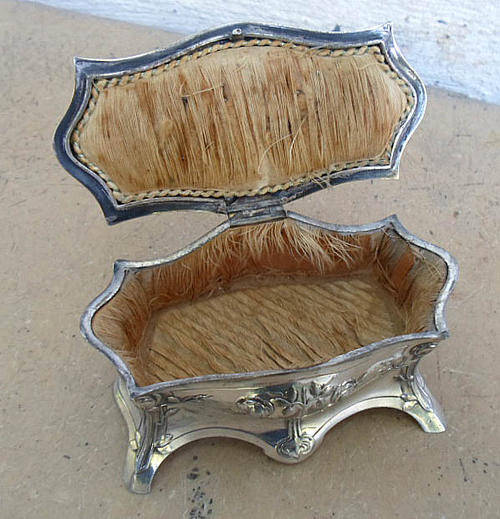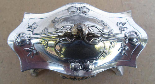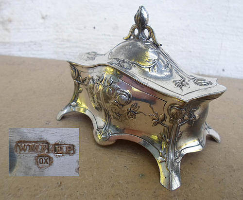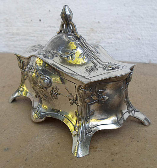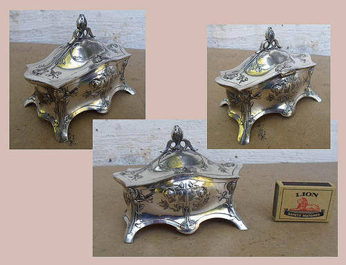 LOTS OF BUY IT NOW DEALS THIS WEEK ON MY OTHER LISTINGS, CHECK THEM OUT. ATTRACTIVE ANTIQUE ART NOUVEAU SILVER PLATE ON PEWTER TRINKET BOX STAMPED WMF EP. NICE RAISED ART NOUVEAU DESIGNS. ORIGINAL INTERIOR, USED AS A PIN CUSHION STILL HAS PINS ATTACHED. INSIDES A LITTLE DISTRESSED, BUT METAL IN GOOD CONDITION, PLATE A LITTLE WORN, BUT NOT DETRACTING AT ALL. HINGE TO LID EXCELLENT. LEFT FRONT FOOT LOOKS SLIGHTLY BENT? MEASURES APPROXIMATELY 10 X 7 X 12 CM.