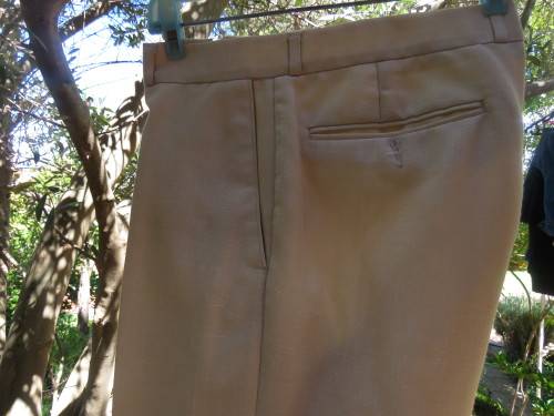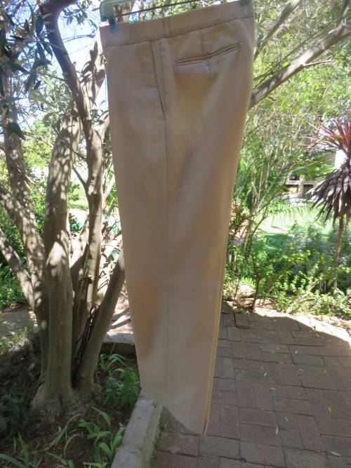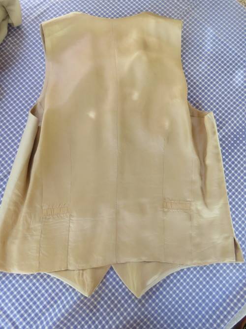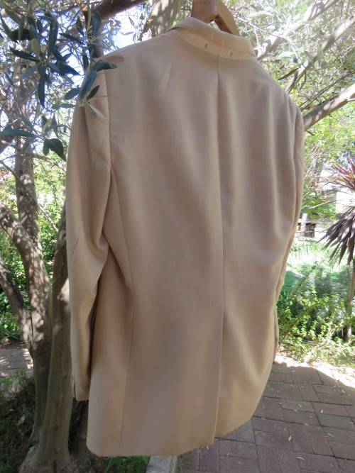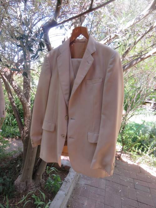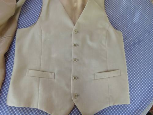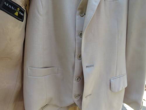 Three piece MAN ABOUT TOWN men's suit in rich cream colour with 40RL jacket and 36/92cm pants + waistcoat.Inside leg 72cm.Good condition.In polyester and new wool blend.