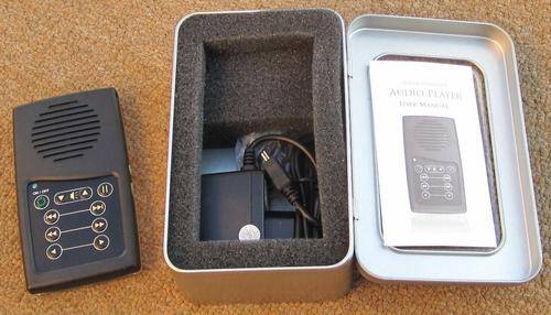 A small, solar-powered digital audio player with the full Bible in New King James Version (NKJV). The retail packaging include the MegaVoice Envoy Bible player, charger to optionally charge it from 220V, Ear buds and metal container.