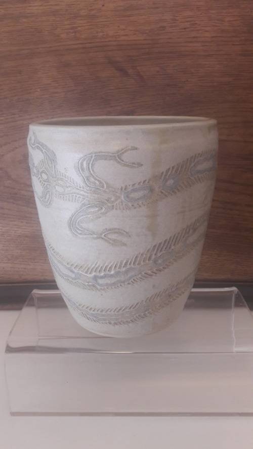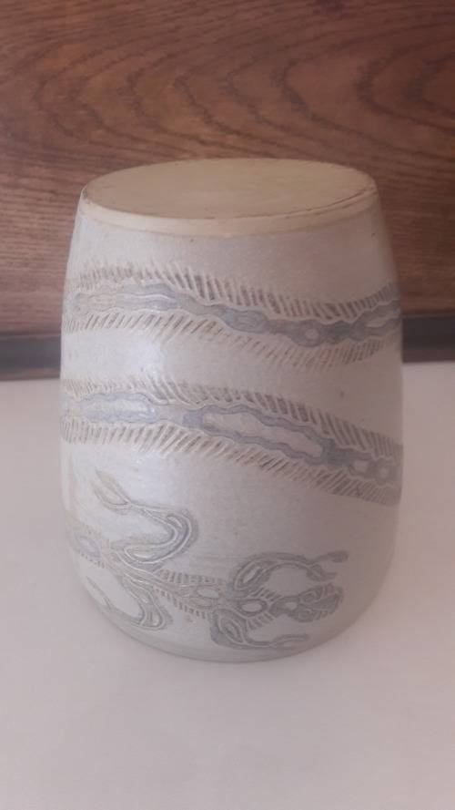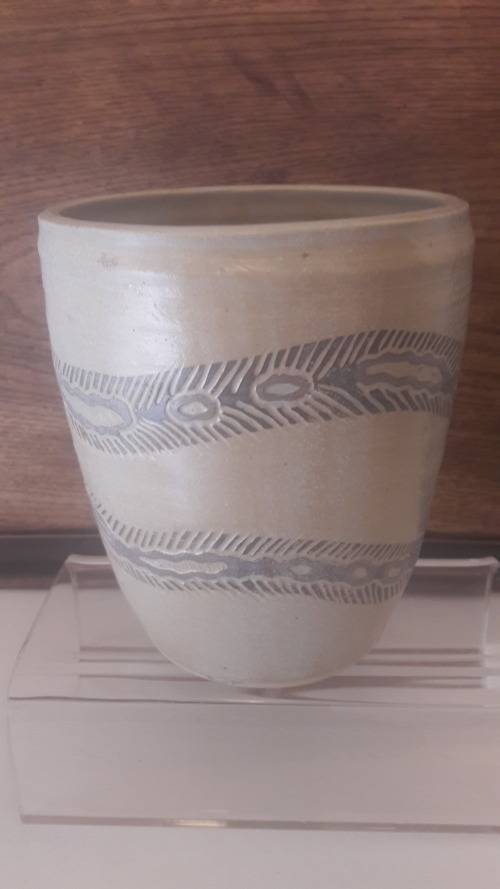 Offered for sale is an unusual and hard to find stoneware studio vase made by an indigenous Australian Aboriginal art potter ; the style of the vase is typical of the work of the brothers Carroll and Derek Thompson who work from a craft centre in the remote North Western part of Southern Australia . This is a hand thrown stoneware vase with a striking etched/sgrafitto motif of a mythological reptile /lizard , an iconic and recurring motif in the complex Dreamtime Story narratives of indigenous Australian Aboriginal people. The image features in creation myths of Aboriginals which typically narrate the inter-relatedness of Humans , animals and the natural environment and the transcendence and shape-shifting of the soul. The vase is made from a buff coloured off white/chamois coloured stoneware with delicate accents of colour viz ochre and slate grey/blue added to enhance the etched motif of the lizard with an extraordinarily long tail which wraps around the circumference of the vase. The lizard motif is pictured from above as an aerial viewpoint in a highly stylized and flattened design typical of Aboriginal art.