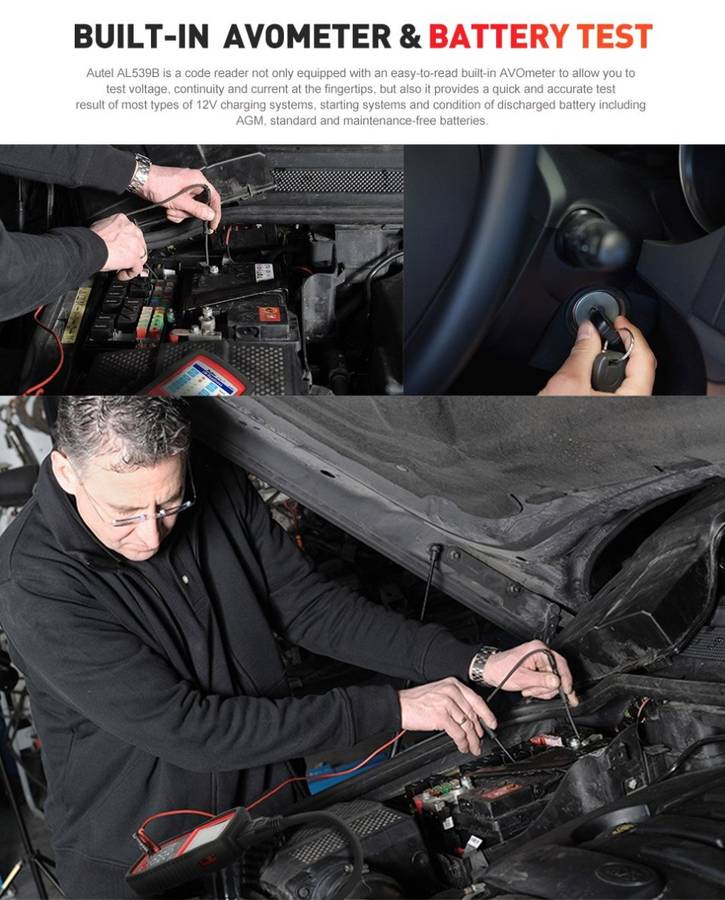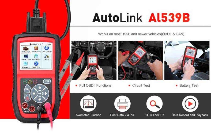 The AutoLink® AL539b OBDII & Electrical Test Tool supports all 10 modes of OBD II test for a complete diagnosis. Featuring the unique patented One-Click I/M Readiness Key, circuit test, starting and charging systems tests, battery test, TFT color display, and built-in speaker, the versatile, easy-to-use AL539b will streamline automotive service and help ensure rapid, accurate diagnosis and timely repair.
