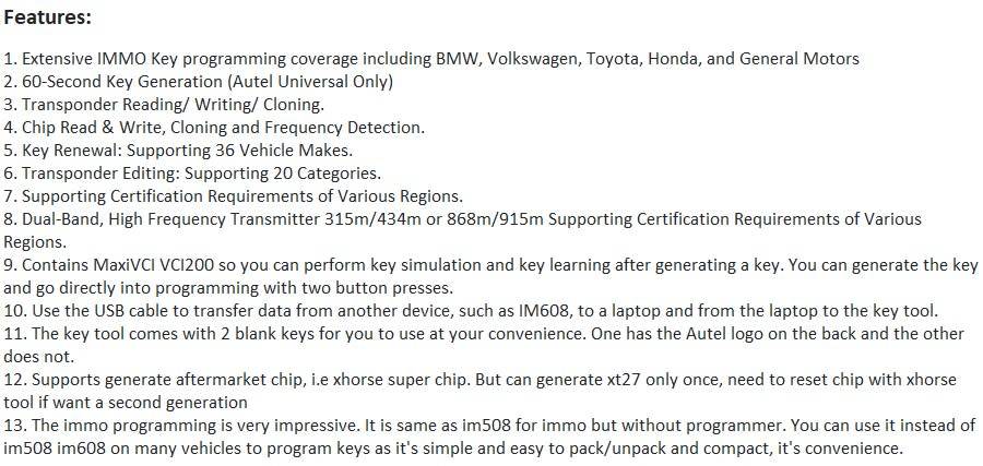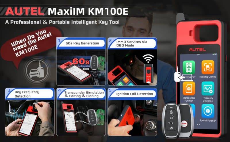 The Autel MaxiIM KM100E is an advanced key and immobilizer tablet capable of smart key creation and IMMO learning via OBD. This 5.5-inch, Android touchscreen tablet with Bluetooth VCI can program the Autel Key as a smart key replacement for more than 700 vehicles and offers IMMO programming capability for multiple vehicle brands including for BMW, Volkswagen, Toyota, Honda, and GM. Additional innovative features include key renewal and Transponder Editing of 20 supported protocols.