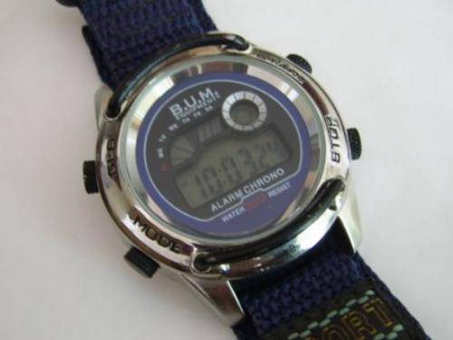 HERE WE HAVE A B.U.M ALARM CHRONO DIGITAL WATCH WITH ROLL BARS FROM THE FAMOUS FASHION HOUSE. IT IS IN NEAR NEW CONDITION AND HAS JUST HAD A NEW LONG LIFE LITHIUM BATTERY FITTED. EVERYTHING WORKS AS IT SHOULD INCLUDING ELECTRIC BLUE LIGHT. IT MEASURES 40MM X 40MM AND IS 30 METERS WATER RESISTANT.