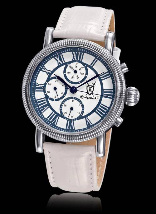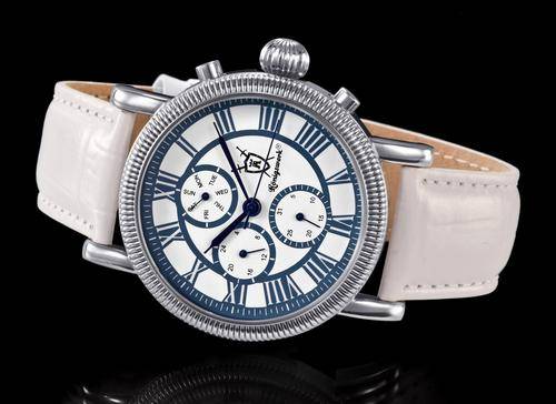 Diameter +- 43 mm without crown - +- 49 mm with crown - Thickness +-12 mm Hours, Minutes, Seconds, Day, Date, Month, - Stainless Steel, polished with Mineral Crystal - three mini faces on main faces, - Watchband leather up to 20 cm - +- 61 Gram. engraved on belt buckle, on face and on back of watch. Shield