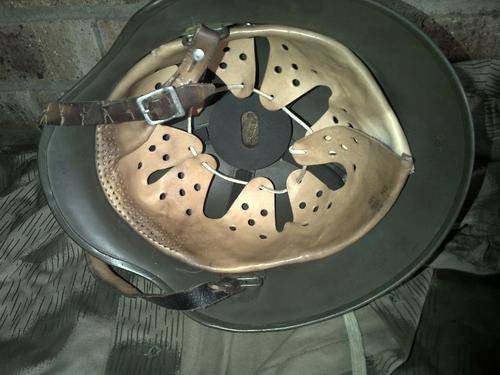 This particular helmet has had the original BGS foam-padded metal liner replaced with a leather liner modeled on that of the M40. It will fit a 58-59 cm head with ease. The chin strap is leather, and worn with age (some cracking present). Given that the helmet is more than 60 years old, this is to be expected.