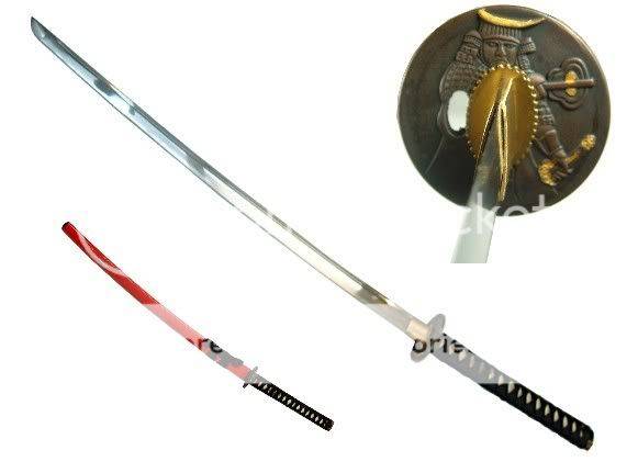 This handmade sword features full-tang construction and has a thick blade that is extremely sharp. The AISI high carbon steel blade (1065) is as sharp as a razor's edge. Quality sageo and ito braid decorate the handle and the Tsuba (guard) is constructed of a two-tone zinc alloy. This katana, with red saya, comes wrapped with a black sword bag and in a large tubular box covered in beautiful artwork. Overall Length: 108.5cm, Blade Length: 71cm, Handle: 30.4cm